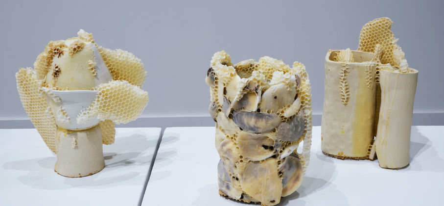 While the artists' methods of producing work for Between Us were, for the most part, the same — placing objects within a beehive for honeybees to transform with the addition of their comb — the resulting work is as varied as the artist themselves.